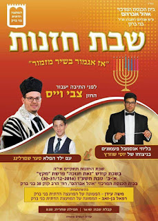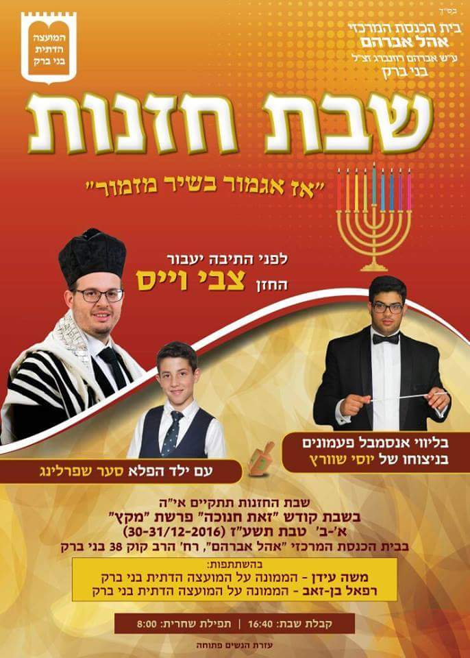 Cantorial Shabbos with Tzvi Weiss and Saar Sperling by Editor · December 27, 2016 A special Cantorial Shabbos will take place this week in the Great Synagogue of Bnei Brak with Cantor Tzvi Weiss and Saar Sperling.They will be accompanied by the Pa’amonim Choir led by Maestro Yossi Shwartz.