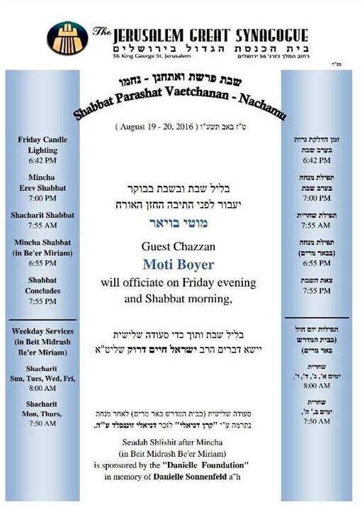 Moti Boyer Guest Chazan at Great Synagogue by Editor · August 17, 2016 Cantor Moti Boyer will be leading the services at the Great Synagogue in Jerusalem this Shabbos, Parshas Nachamu.