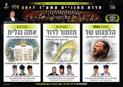 The first concert (1.2.17): Helfgot sings Yankele Talmud and Moshe Koussevitzky, will feature leading prefomrer Cantor Yitzchak Meir Helfgot with guest cantors Shai Abramson, Israel Rand.